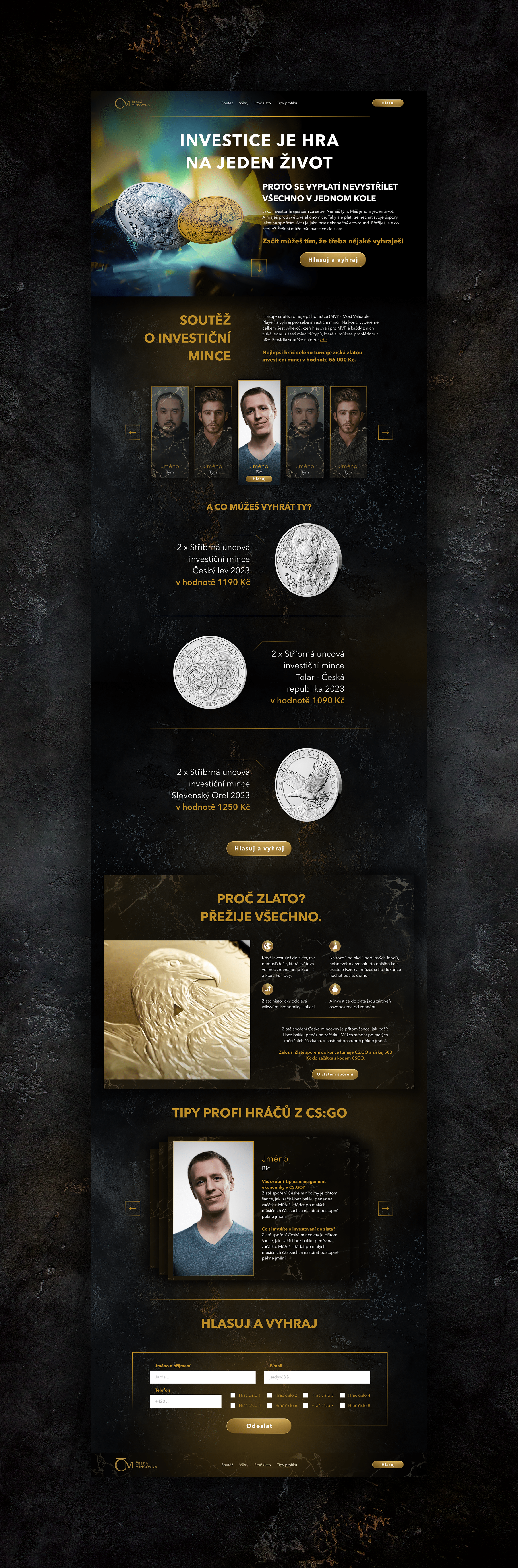 Hlasování o nejlepšího hráče Tipsport MČR v CS:GO doprovázela soutěž o stříbrné investiční mince a edukační kampaň o investování do zlata. Spojili jsme svět e-sportu s finanční tematikou a výsledkem byl výrazný vizuální styl založený na motivech kovů, kamene a světla. Vytvořil jsem vizuály bannerů i temně laděnou landing page, které skvěle doplnily výborné texty Markét Tomanové. Herní napětí a investiční vášeň nikdy neměly k sobě blíže.