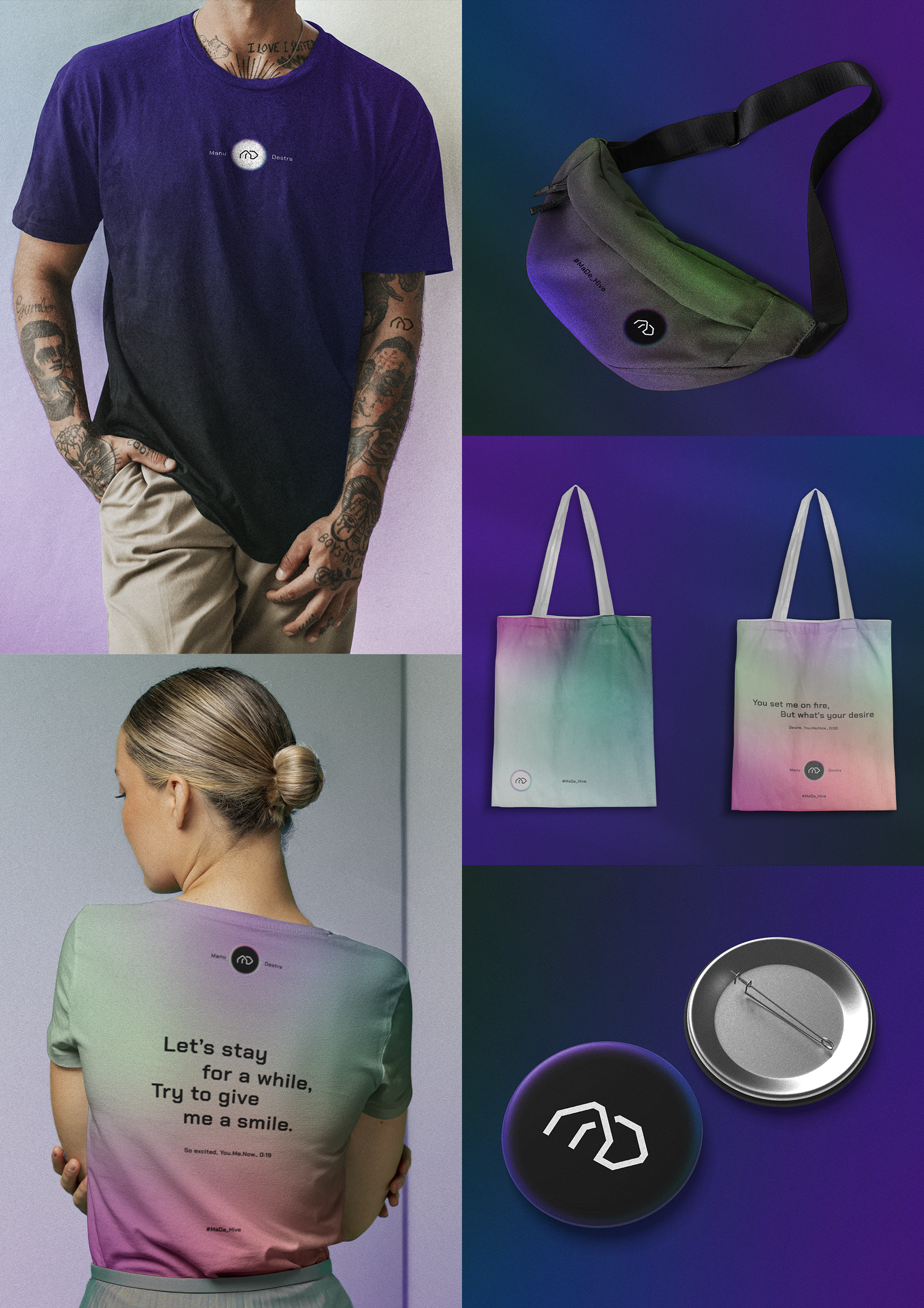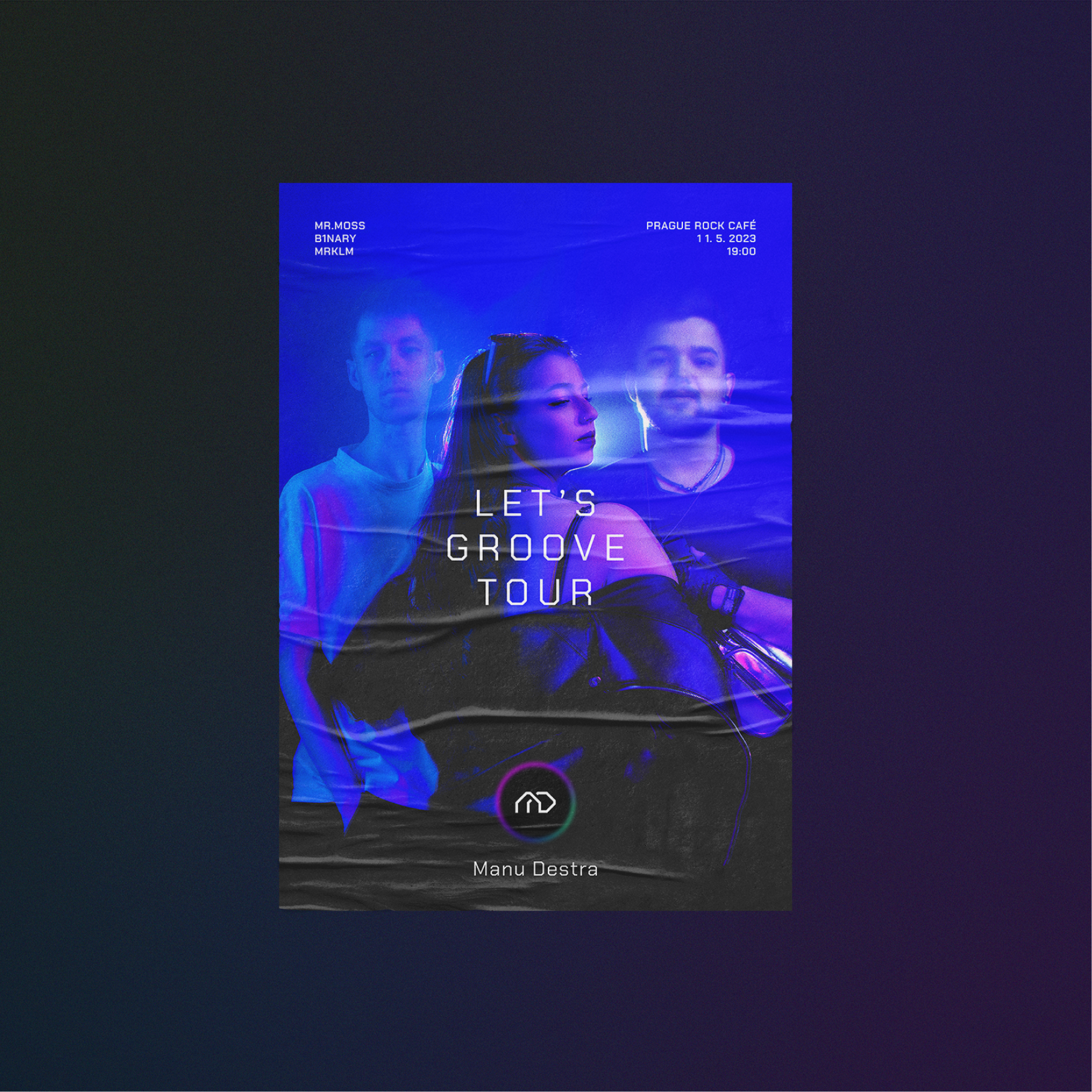 Každé album této elektro-popové kapely přináší novou vizuální identitu – tentokrát byla řada na mně. Zadání? Iniciály MD a neony. Navrhl jsem logo složené z jediné propojené linky vycházející z tvarosloví fontu Chakra Petch. Výsledkem je symbol, který vizuálně připomíná rytmus elektronické hudby a zároveň nese charakter značky kapely. Součástí systému je i variabilní pozadí s barevně modifikovatelnou rozostřenou linkou ve třech neonových přechodech. Novou identitu bylo možné vidět mimo jiné na Rock for People 2023.